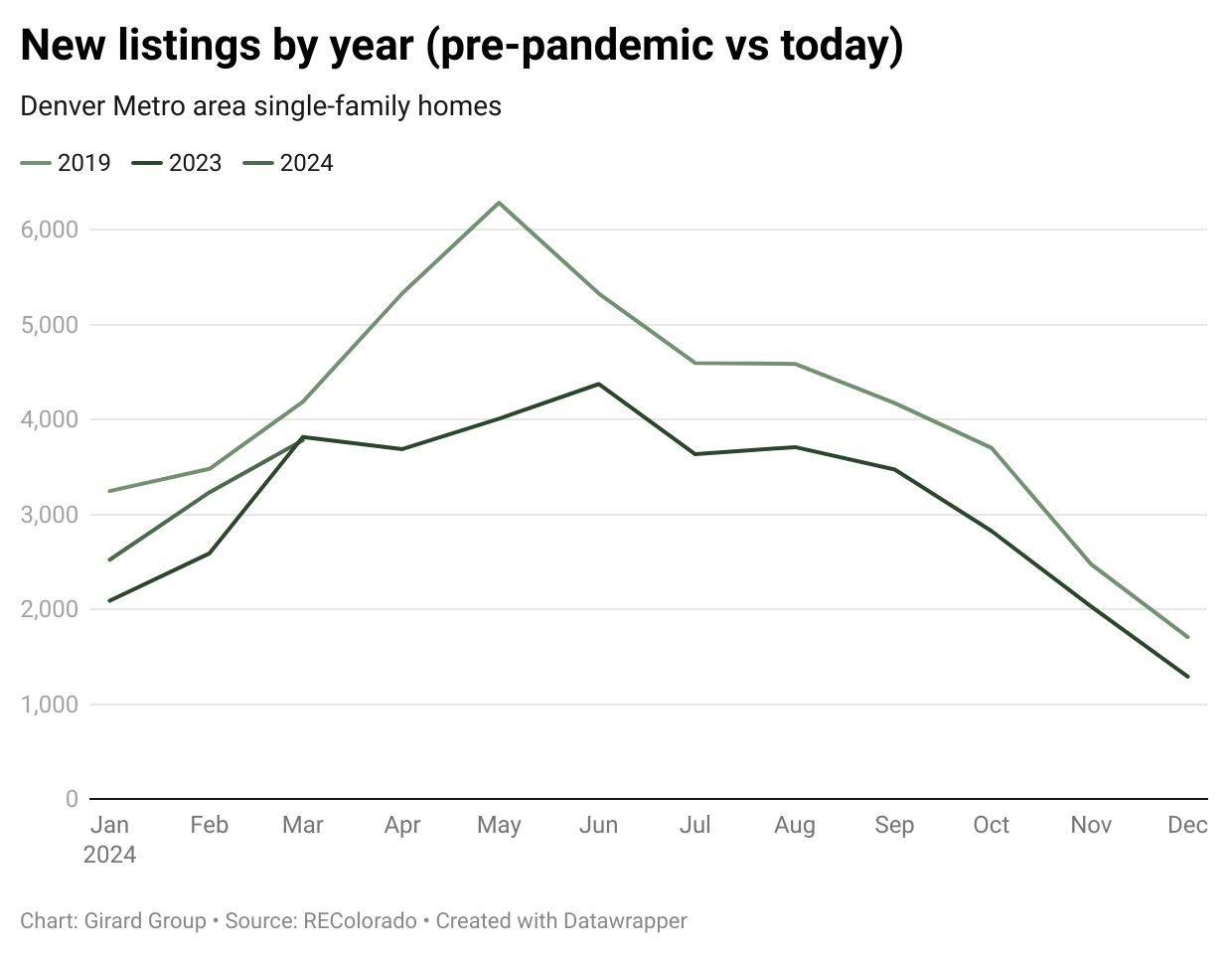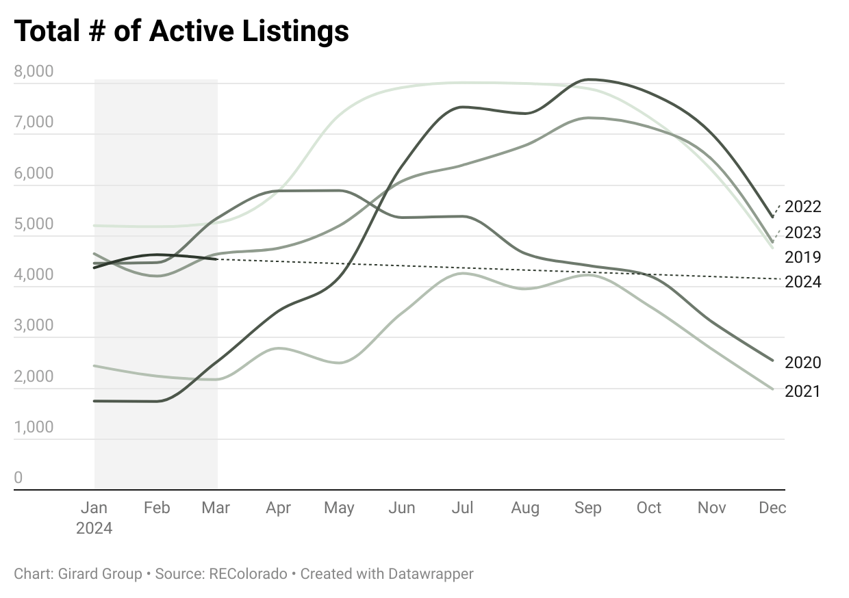 New listings are increasing, but are still slightly lower than at this time last year (-1%); the # of total listings on the market is also lower (-2%) than in March of 2023